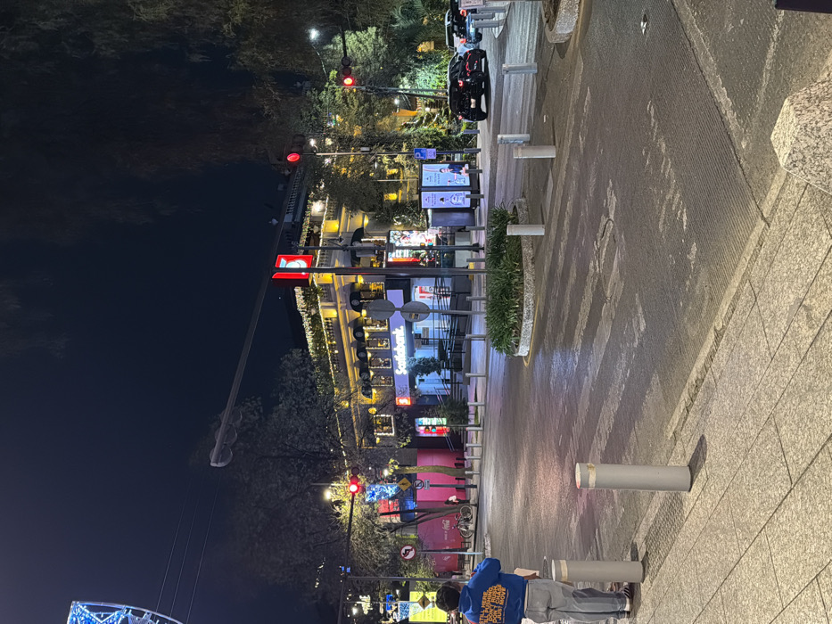 A nighttime street scene shows a street with multiple red traffic lights. Buildings line the street, illuminated with lights and signage. A person in a blue shirt stands on the sidewalk, near cylindrical bollards. Cars are parked along the street. The street surface is wet. Trees and other vegetation are visible amongst the buildings and traffic lights.
