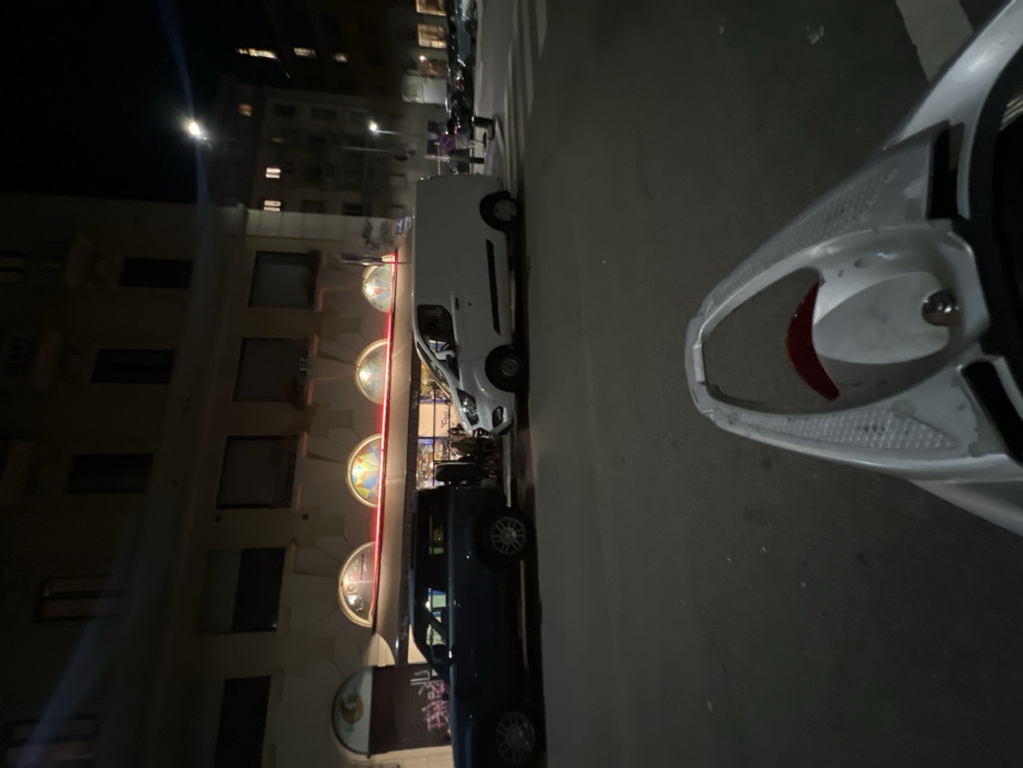 The image depicts a nighttime street scene in Milan, Italy, specifically looking towards Bar Magenta at Via Giosuè Carducci, 13. The perspective is from the rear of a light-colored scooter or motorcycle, with its silver-toned rear rack and red tail light visible in the immediate foreground, obscuring the lower center of the frame. In the midground, two vehicles are visible on the asphalt street, facing right. The closer vehicle is a dark blue SUV, possibly a Land Rover Defender. Immediately behind it is a white Ford Transit Custom panel van. The background features a multi-story building with a light-colored facade. At street level, Bar Magenta is prominently illuminated. It has a dark awning over its entrance and a series of five distinctive arched windows above, each featuring colorful, stained-glass-like patterns with red neon-style lighting accentuating their arches. Below the leftmost arch, a shuttered section is covered in red graffiti. Patrons are visible inside the brightly lit establishment. Above Bar Magenta, the building's upper floors display multiple dark windows, some with faint interior lighting. To the right of the primary building, another street light illuminates a further building with visible windows. A pedestrian crosswalk is partially visible on the street to the right of the white van. Additional parked vehicles are discernable further down the street on the right. The sky is dark, indicating night.