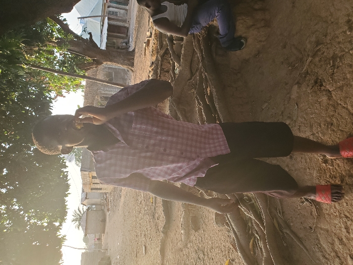A male subject stands outdoors in Akwanga, Nigeria, captured from a slightly low angle. The subject, a young Black male, wears a light-colored plaid short-sleeved button-up shirt, dark knee-length shorts, and red slide sandals. He holds a light-colored, irregular object to his mouth with his right hand. His left arm is down at his side. To the subject's right and slightly behind him, a second male subject, also Black, is partially visible, seated on an elevated earthen mound or large tree roots. This individual wears a light-colored tank top and dark trousers. The ground throughout the scene is dry, light brown soil, with numerous thick, exposed tree roots prominent in the foreground and mid-ground. The background features several single-story structures, predominantly constructed from concrete blocks, some with corrugated metal roofs, amidst a sparse scattering of vegetation and large trees. The lighting suggests a low sun angle, possibly late afternoon or early morning.