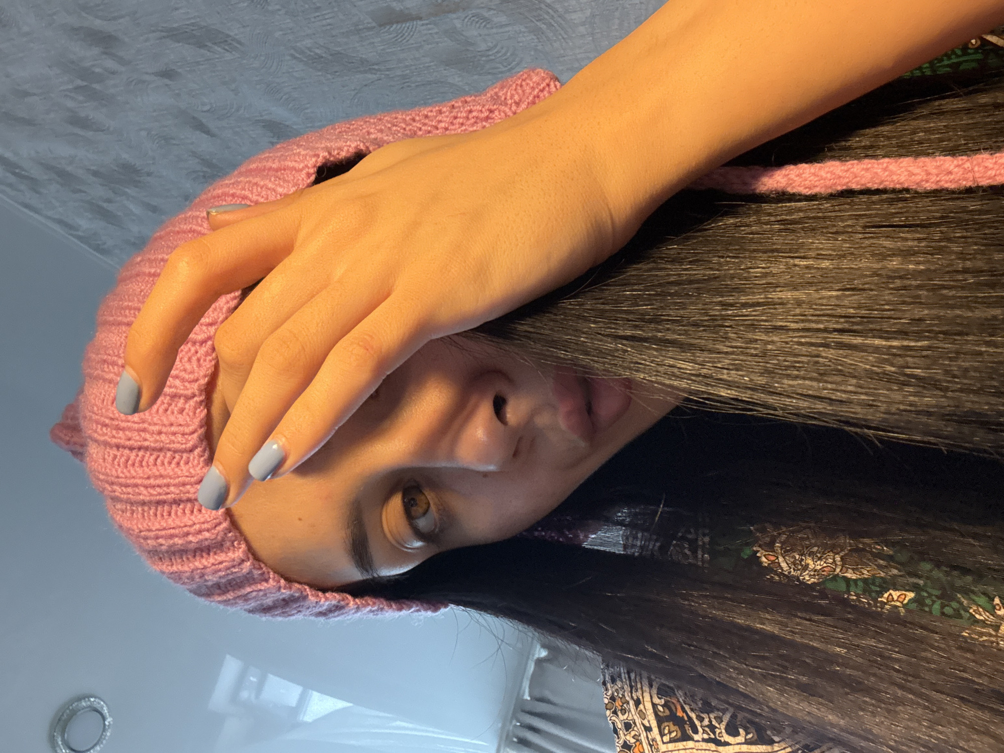 A woman with light skin and long, dark hair is facing the camera. She is wearing a pink knit hat and has her hand on her forehead. Her nails are painted a light blue color. She is wearing a patterned shirt or robe. The background appears to be a white surface, potentially a sink or counter. There is no information about the location in the city of Votkinsk, Russia, in the image.