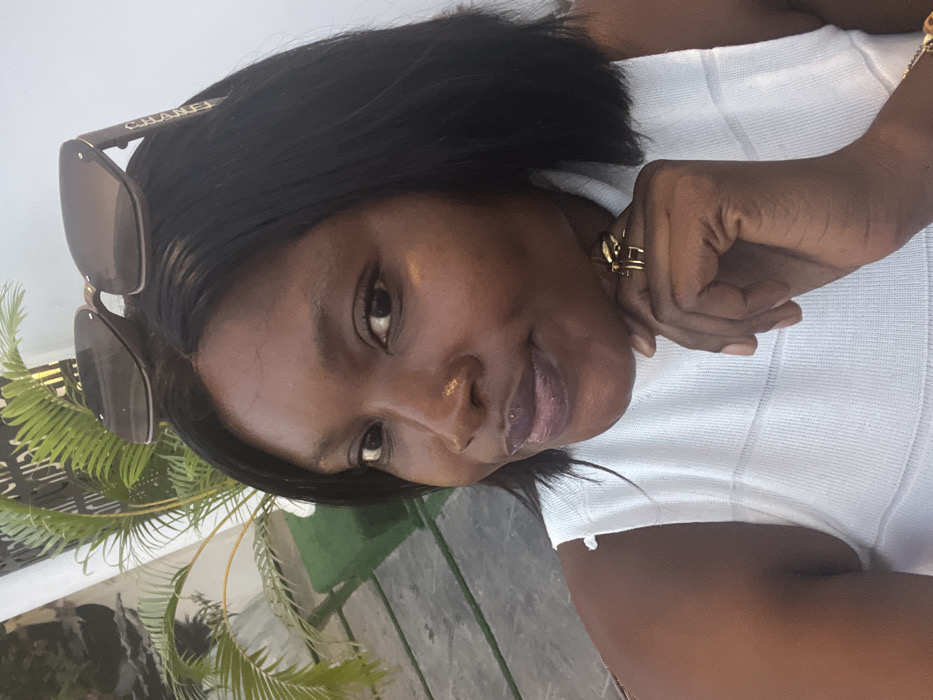 A dark-skinned female subject is depicted in a medium shot, looking directly towards the camera with a slight smile