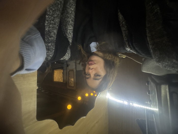 A woman with long brown hair and neutral expression looks into the camera. She wears a black coat with a fur collar, a grey sweater, and a grey and black patterned scarf. In the background, a train car sits on a track, visible through windows. Orange lights dot the train platform. A string of white lights blurs in the distance. A hand and arm are slightly out of focus in the foreground. The image appears to be taken indoors.