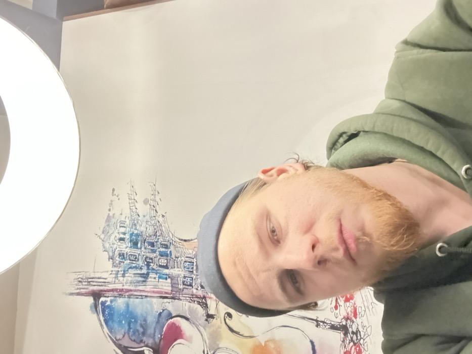 A blond man with a reddish beard and wearing a blue beanie and green hoodie takes a selfie. A ring light is visible on the left. Behind the man is a painting featuring a building-like structure above a colorful abstract design resembling a violin. The painting is dominated by blue, white, and red hues. The man's face is prominent, with focus on his eyes and lips.