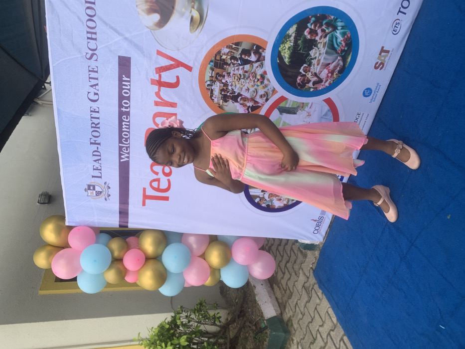 young girl standing in front of a banner that reads "LEAD-FORTE GATE SCHOOL Welcome to our Tea Party". She is wearing a pink and white dress and pink shoes. The girl is holding her right hand to her chest. She is standing in front of a blue tarp. To her left is an archway of gold and pink balloons. There is a white building in the background. This image was taken at the Lead-Forte Gate School, which is located in Lagos, Nigeria at latitude: 6.57 and longitude: 3.39. The banner also includes the logos of COBIS, Cambridge International Examinations, The International School Board, and ETS. There are several smaller images of children having tea parties displayed on the banner. The scene is a celebratory event for the children, and the girl appears to be enjoying herself. The environment is bright and cheerful.