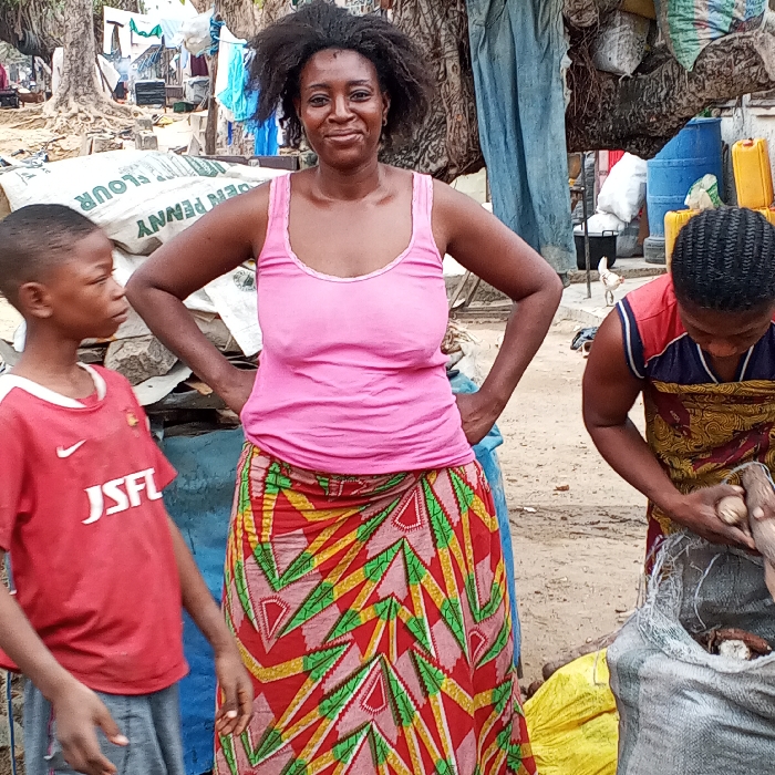 A woman in a pink tank top and patterned skirt stands with her hands on her hips, smiling at the camera. A young boy in a red jersey stands to her left, looking off-camera. To the right, another woman in a patterned top sorts through produce in a bag. Bags labeled 'flour' and blue drums are visible in the background. The scene appears to be set outdoors in a market or village.