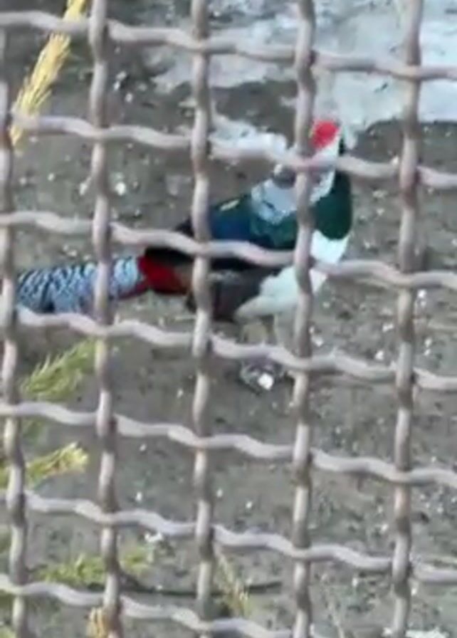 A person is filming a bird in a cage. The bird has white, red, green, and black markings. The ground is light brown and there are a few blades of grass. The cage bars are dark grey. Another bird with red and brown feathers is visible near the first.