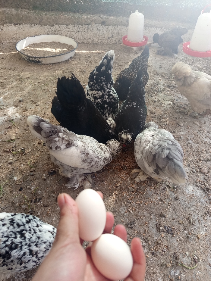 The scene depicts a domestic chicken enclosure located in Goce Delcev, Bulgaria. In the foreground, a human hand holds two white chicken eggs. Directly behind the hand, a group of five chickens of various breeds and coloration are actively feeding on scattered grain on the dirt ground. These include predominantly black, black and white mottled, and grey and white speckled individuals. To the upper left, an enamel bowl containing feed rests on the ground. Two white plastic chicken feeders with red bases are visible in the mid-background, one on the right and another further back. Two additional chickens are present in the background: one light-colored chicken with a feathered crest on its head is positioned to the right, and a darker chicken is partially visible further back. The environment consists of a dirt and gravel floor, with a partial concrete block wall and a mesh fence visible in the background. The area is illuminated by natural light.