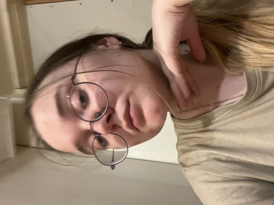 The image depicts a close-up, chest-up self-portrait of a young adult female in an indoor setting