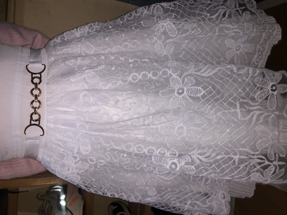 white dress with a lace overlay. The lace features a repeating floral and circular pattern with a geometric net design. A white belt with gold chain detailing is visible on the waist. Other clothing and items are situated beneath the dress.