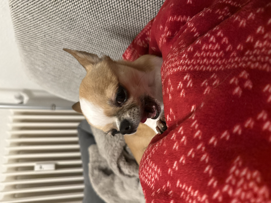 A small Chihuahua with tan fur and a white forehead is nestled in a cozy red blanket with a white snowflake pattern. The dog's head is tilted upwards, revealing its tongue slightly protruding from its mouth. The animal is lying near a gray couch and a white radiator. The scene is well-lit.