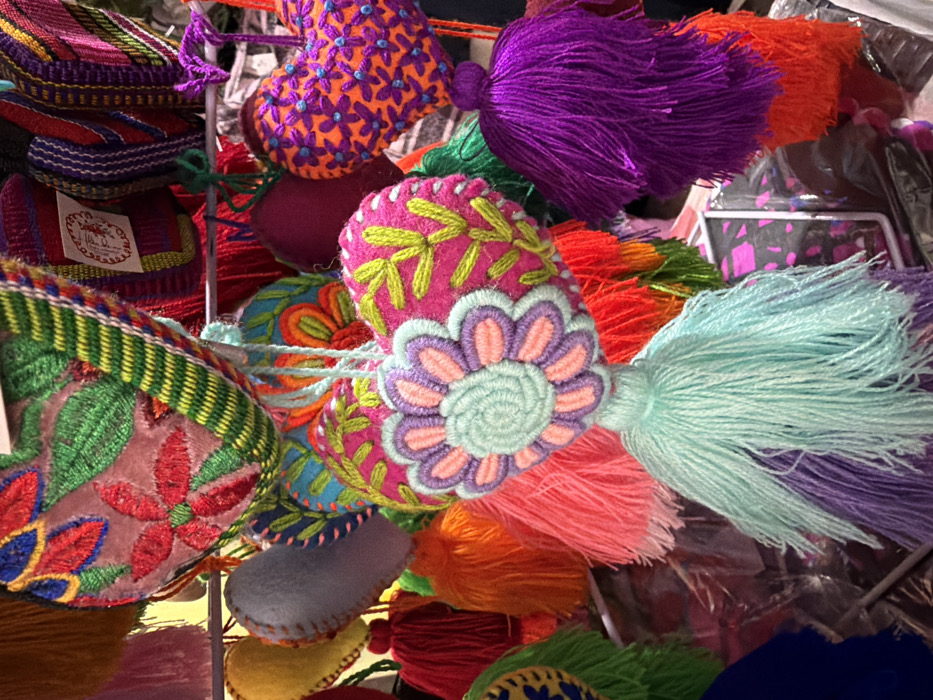 A vibrant collection of handmade items features embroidered pouches and tassels