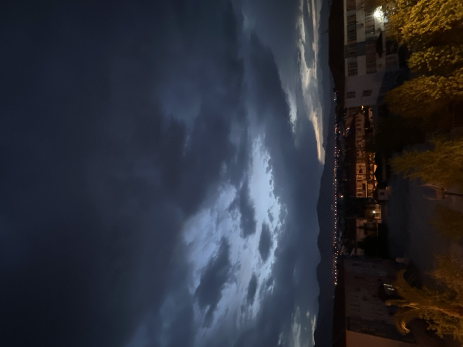 This image presents an elevated, wide-angle view of the city of Fethiye, Turkey, during twilight or pre-dawn hours. The dominant feature is a heavily overcast sky, filled with dense, dark grey and blue-grey clouds. A central, lighter blue-grey area indicates thinner cloud cover, while a faint orange-yellow hue is visible on the far right horizon, suggesting an obscured sun. Below the horizon, a dark mountain range extends across the entire background. The cityscape of Fethiye occupies the middle ground, illuminated by numerous artificial lights from buildings and streets, appearing as scattered bright points. In the immediate foreground, a multi-story building with a light-colored facade is partially visible on the left, bordering what appears to be a dark street or open space. On the right, another multi-story building, predominantly white with visible windows and balconies, is prominent. Trees with dark foliage and some areas illuminated with a yellowish glow are positioned in the bottom-right and bottom-middle foreground, and a partial view of a palm tree is present in the bottom-left. No individuals, specific actions, or interactions are discernible in the scene.