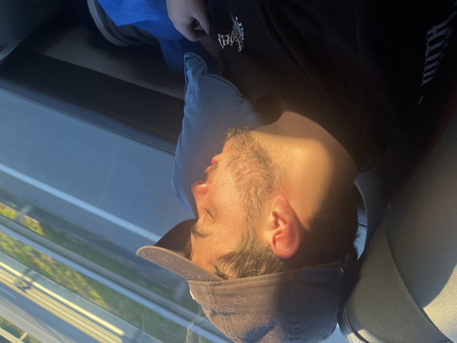 An adult male subject is depicted sleeping in the passenger seat of a vehicle in Leiria, Portugal