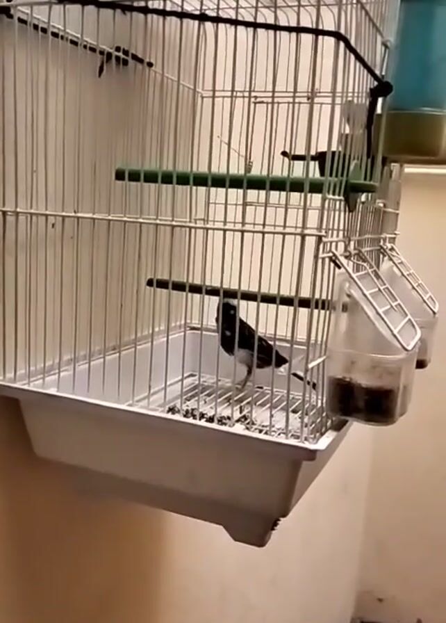 bird in a white cage hanging on a light-colored wall. The bird is black and white and is seen on the floor of the cage. It then hops onto a perch in the cage. There are two clear plastic containers attached to the outside of the cage, which appear to contain birdseed.