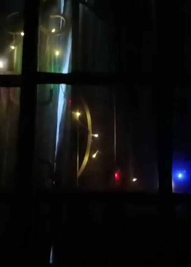 A close-up video shows a window at night. The window is divided into eight panes and has a black frame. A white curtain hangs behind the window. A string of colorful lights is draped across the curtain, featuring yellow, red, blue, and green bulbs. The lights are on, casting a warm, festive glow. A brief flicker occurs, causing the image to darken momentarily.