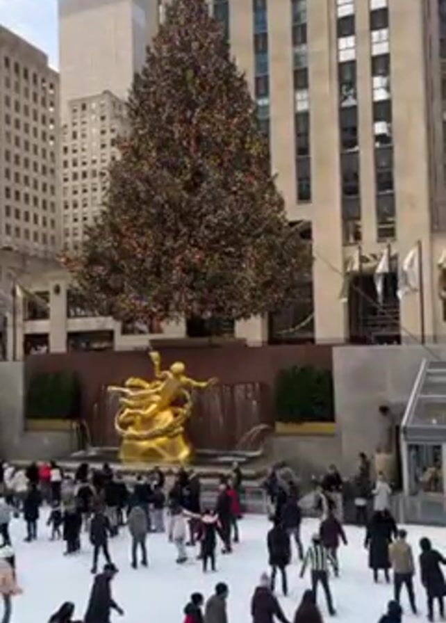 Rockefeller Center ice skating rink in New York City. Many people are ice skating. A large Christmas tree with a star on top stands behind a golden statue and fountain at the far end of the rink. Tall buildings surround the area. The sky is light blue with few clouds.
