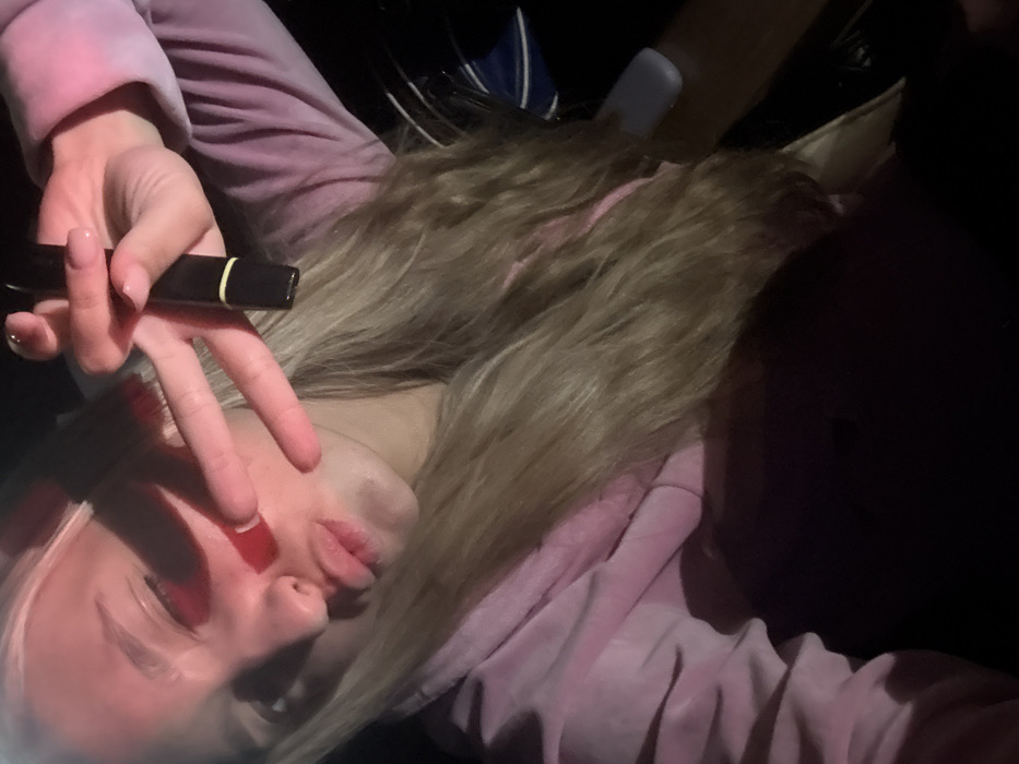 young individual with long, wavy blonde hair, positioned from the chest up within a dimly lit environment. The subject is wearing a pink velour-like hooded garment. A strong reddish-pink light source illuminates the left side of their face, casting shadows across their right eye. The individual's lips are puckered into a "duck face" expression. Their left hand is raised, forming a V-sign with the index and middle fingers, partially obscuring their left cheek and eye. The right hand holds a dark-colored, cylindrical object, consistent with an electronic vape pen, between the thumb and index finger. The background is dark and indistinct, appearing to be an enclosed space such as a vehicle interior or a room, with faint hints of a blue and a white object visible on the right side. The specific location within Plovdiv, Bulgaria, cannot be determined from the visual information present in the image.