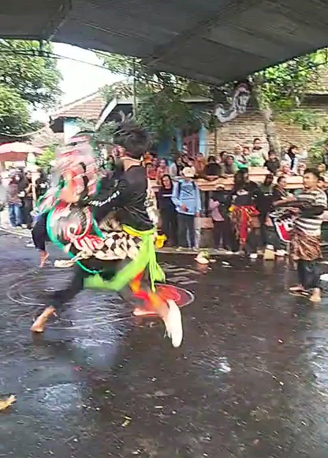 A video shows a street performance taking place in a wet, covered area. A crowd of people, mostly wearing casual clothes, are watching two men dressed in black clothing perform. One man has purple hair. They are interacting with a figure dressed in bright green, red, white, and black traditional attire, which appears to be a costume of some sort. The performance takes place on the wet ground. The background includes trees and buildings. The video is vertically oriented.