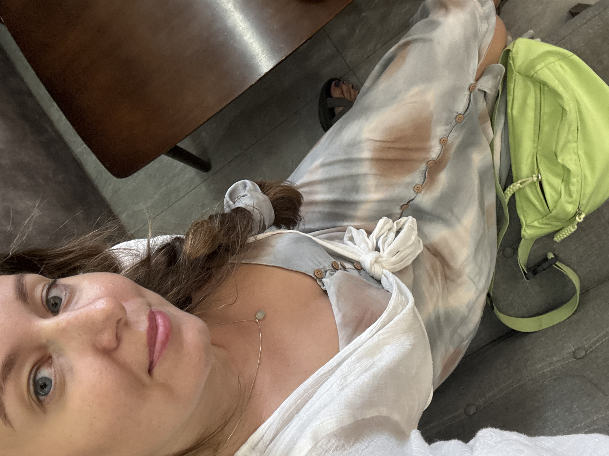 A female subject is depicted from the chest up to mid-thigh, looking directly at the camera. She possesses fair skin, blue eyes, and light brown hair styled in a braid over her right shoulder, secured with a light blue scrunchie. She wears a thin silver necklace with a small circular pendant. Her attire includes a white, loose-fitting, long-sleeved top worn over a light blue and brown tie-dye dress, which features wooden buttons down the front and a prominent knotted fabric detail at the waist. In the lower left foreground, a bright neon green fanny pack is positioned on a dark grey upholstered surface. To the subject's right, a dark brown wooden table is partially visible. Beneath the table, a dark-colored sandal or shoe is seen on a dark grey tiled floor. The background consists of a plain dark grey wall, indicating an indoor setting such as a cafe or restaurant. The precise location within the city of Nha Trang, Vietnam, is not discernible from the visual information presented.