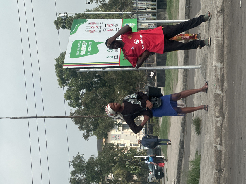 A daytime scene in Ikota, Lagos State, Nigeria, features two individuals standing on a concrete sidewalk alongside a road
