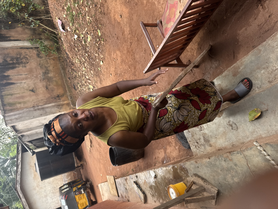 A woman stands in an outdoor space, wearing a yellow top, floral skirt, and a patterned head wrap. She holds a wooden plank. Behind her, there's a weathered building, a small vehicle, and various objects including a bucket and a black container. Part of a wooden cot is visible in the upper right corner. The ground is reddish-brown, suggesting soil or dirt, with concrete slabs visible around her feet. A fallen leaf rests near her sandal. The overall scene is captured in a slightly off-kilter angle.