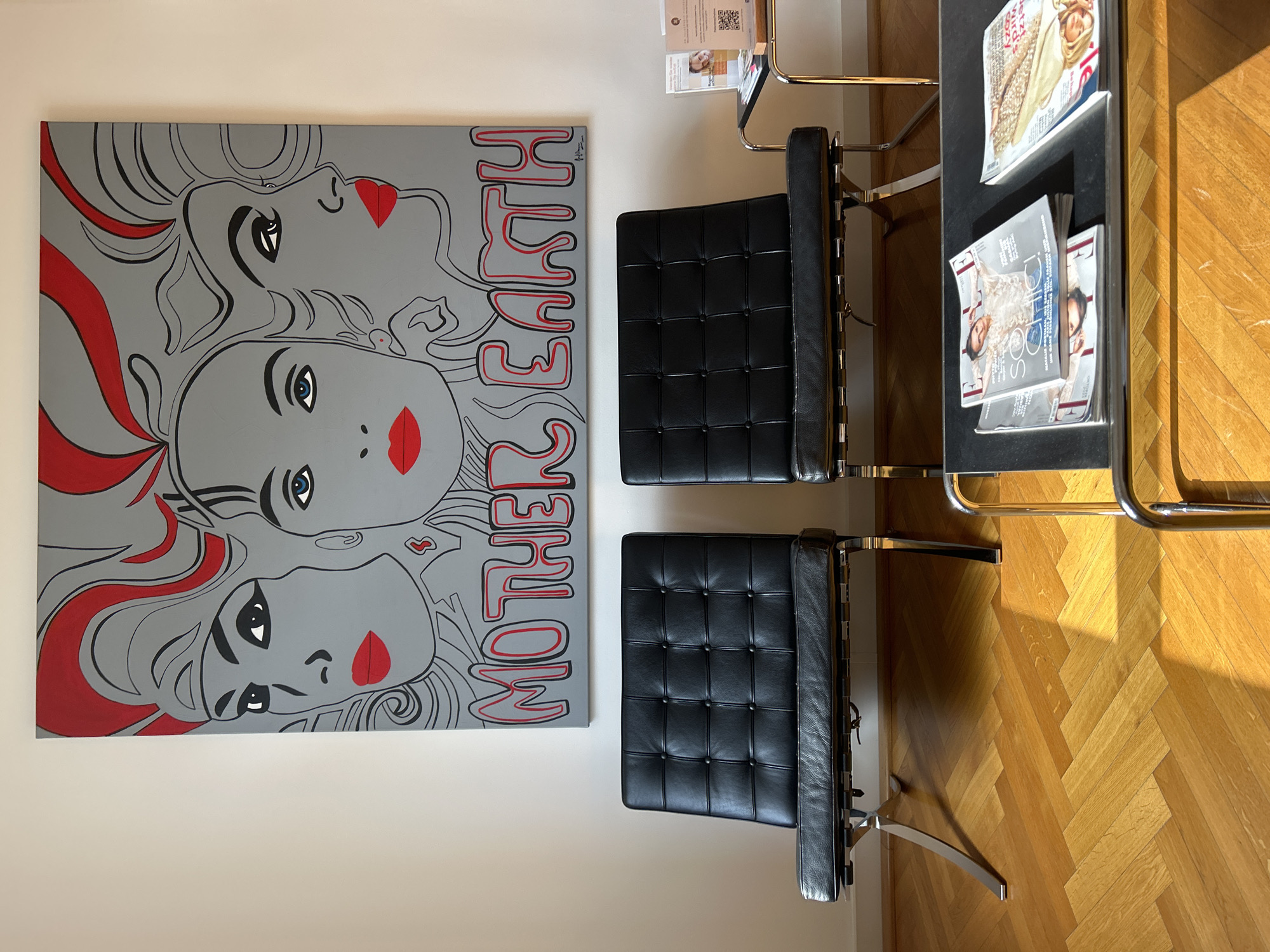 The image displays an interior waiting area or reception room, identified as the Praxis Dr. Julia Rohrer, located at Sendlinger Str. 11, 80331 Munich, Germany. No individuals are present in the scene. A large, rectangular pop-art style painting dominates the center of a plain light-colored wall. The artwork depicts three stylized female faces, rendered in grey with black outlines and prominent red accents on their hair/headpieces and lips. One face exhibits blue eyes, while the others feature black eyes. Below the faces, the phrase "MOTHER EARTH" is written in red-outlined grey block letters. A signature is visible in the bottom right corner of the painting. Below the artwork, two identical black leather Barcelona chairs, characterized by tufted cushions and polished chrome frames, are positioned side-by-side. In the foreground, a low rectangular coffee table with a dark top and chrome frame holds a stack of magazines, including "ELLE." To the right of the rightmost chair, a smaller round side table, also with a dark top and chrome frame, displays several brochures and flyers. Visible text on one flyer references "Dr. Julia Rohrer" and includes a QR code, consistent with an aesthetic medical practice. The floor consists of light-colored hardwood laid in a herringbone pattern. Defined shadows are cast across the flooring by an external light source. The environment appears clean, organized, and professionally furnished.