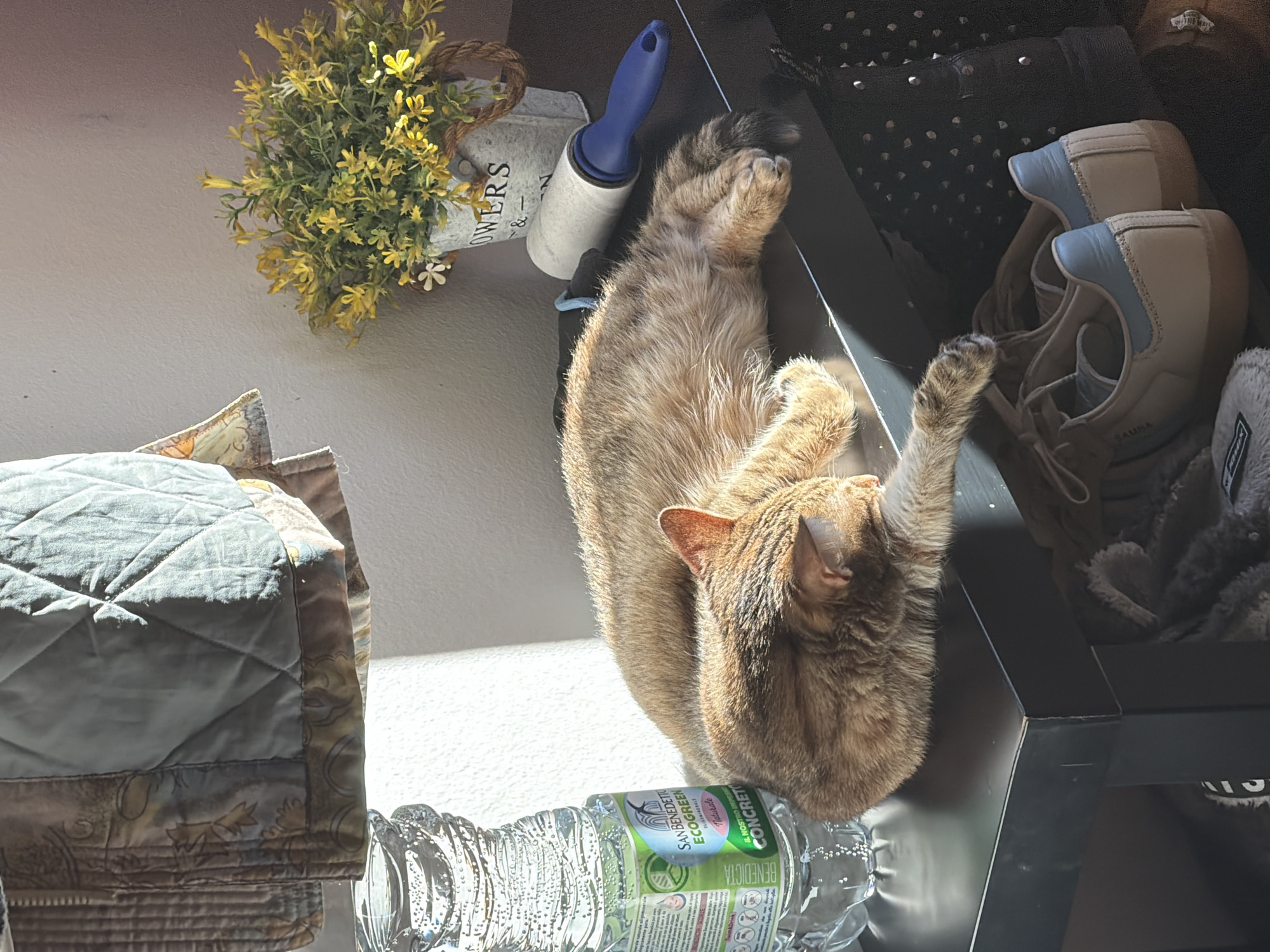 - "An indoor scene, likely a residential corner in Milan, Italy, features a tabby cat resting on a dark, rectangular table or shelf" by FM-x8N2J3, licensed under CC BY 4.0