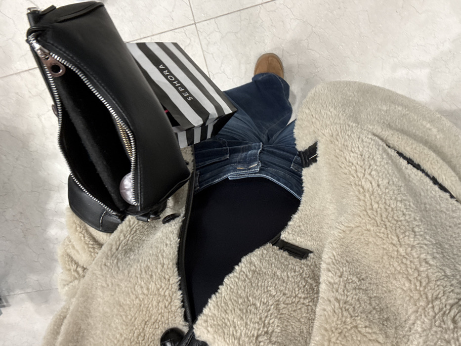 An overhead, high-angle image depicts an individual standing indoors on a light-colored, tiled floor, consistent with a commercial shopping environment in Saint-Laurent-du-Var, France. The person wears a cream-colored, textured, fleece-lined jacket with black trim, a dark blue or black top, blue denim jeans, and brown suede-like low-cut shoes on the visible right foot. They carry a black, cylindrical, zippered handbag, which is open, revealing a light-colored, possibly spherical object inside. Adjacent to the handbag, the individual holds a white shopping bag with black horizontal stripes and the "SEPHORA" logo. The tiled floor is clean and reflective, featuring visible grout lines.