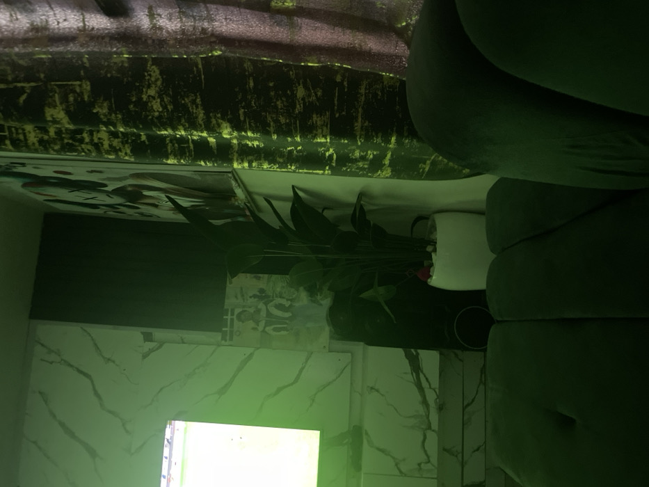 This image depicts an interior room located in Okpanam, Nigeria. The scene is dimly lit with a predominant green ambient light, casting a uniform tint across all visible surfaces. On the far left, a television screen emits a bright green light, its content indistinguishable. Below the screen is a dark, flat surface. The wall behind the television features a white finish with distinct grey marble-like veining. Adjacent to this marbled wall, a tall, slender black speaker stands vertically on the floor. Above the speaker, a framed picture displays two indistinct human figures in a stylized pose. To the right of the speaker, a large potted plant with dark green leaves is contained within a white, rounded planter. The soil is covered with white stones, interspersed with small red and white decorative elements. Above this plant, a large piece of wall art featuring a KAWS-style character with 'X' eyes is partially visible. The right side of the image reveals heavy, dark green and gold textured curtains, drawn to cover a window or wall section. In the immediate foreground, filling the lower right portion of the frame, is a dark green velvet-upholstered couch or armchair, displaying visible tufting on its backrest and seat. No individuals are present or engaged in any discernible action within the frame.