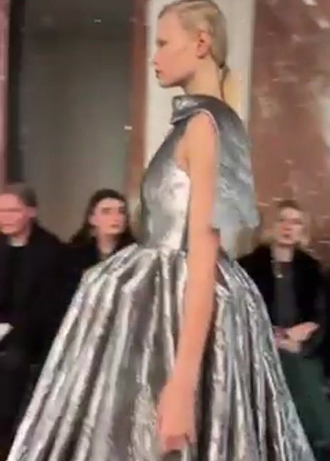fashion model on a runway. She is wearing a sleeveless, silver, floor-length dress with a unique shape. The dress is cinched at the waist and flares out dramatically from there. The top of the dress features a high neck and decorative shoulder pieces that are small extensions resembling capelets. She has blonde hair pulled back in a low ponytail. The model walks away from the camera, allowing a view of the open back of the dress. The runway is within a building with marble-patterned walls and a checkered, cream-and-brown tiled floor. On either side of the runway, people are seated, watching the show. Some audience members are holding up phones to record or photograph the model. The environment appears to be a luxury event or fashion show. A doorway is visible at the far end of the runway, leading to an outdoor area.