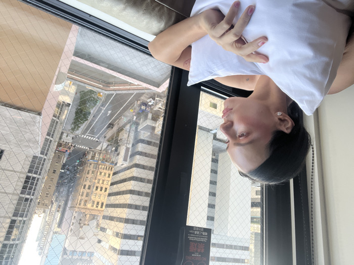 A woman reclines against a brown leather headrest, cradling a white pillow. She looks toward the window, which offers a high-rise view of city streets below. The streets are lined with buildings, cars, and some greenery. The window is partially obscured by a fine wire mesh. A black sign with text in a foreign language is affixed to the window frame.