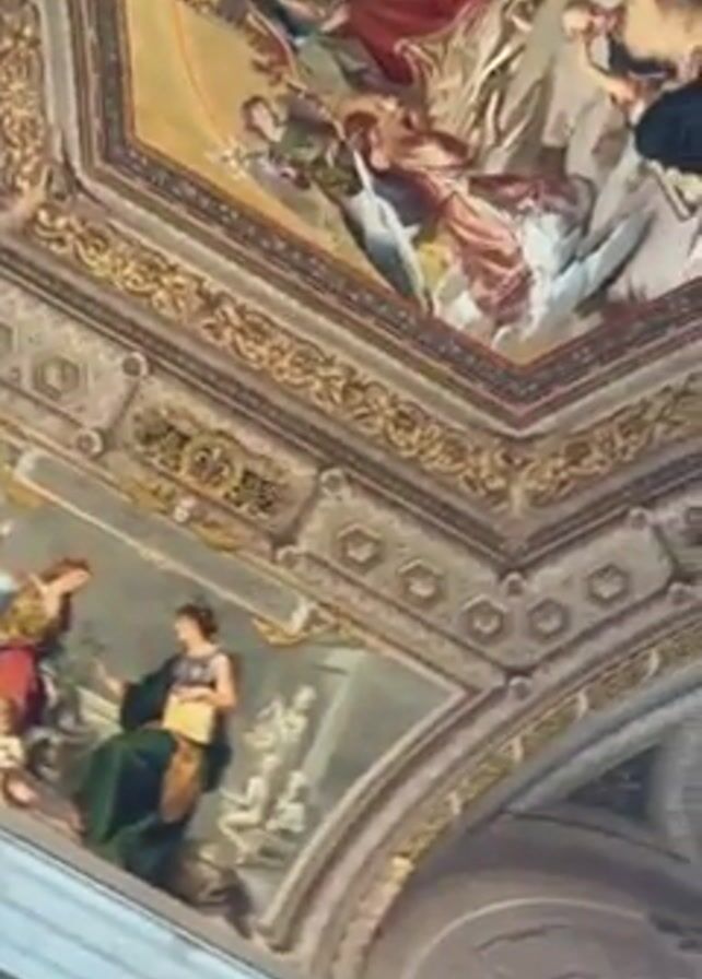 The camera pans across a highly ornate ceiling adorned with frescoes