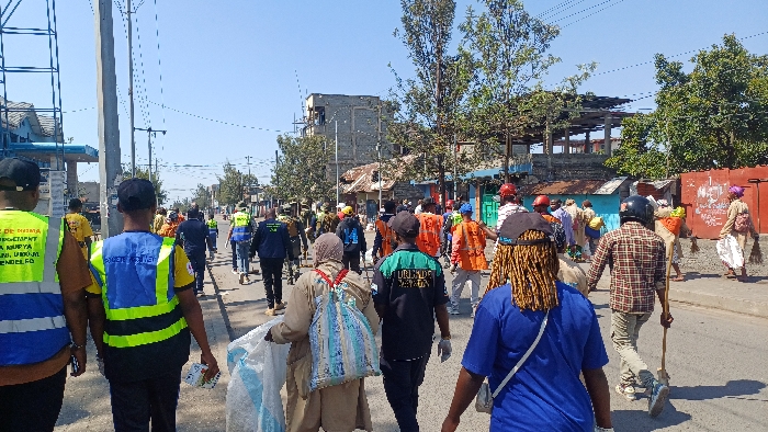 The image displays an urban street scene in Gisenyi, Rwanda, featuring a large group of approximately 30-40 individuals engaged in a collective cleanup activity