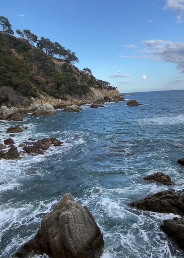 rocky coastline meeting the ocean under a partly cloudy blue sky. Green trees top a small cliff bordering the water. Large rocks dot the shoreline and jut out from the sea, with waves crashing around them. The sea is a deep blue color.