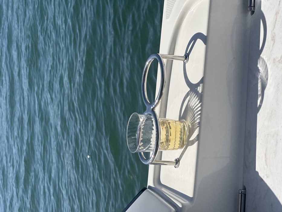 The image displays a clear, sunny, daytime scene aboard a vessel on the water in Newport Beach, United States. The primary subject is a clear, textured tumbler glass, approximately half-filled with a light yellow liquid, secured within a polished silver metallic, dual-ring cup holder mounted to the white fiberglass surface of a boat. The glass exhibits a distinct faceted or ridged texture, creating intricate shadow patterns on the boat's surface to the left. The cup holder itself casts sharp shadows, indicating bright overhead sunlight. To the right of the cup holder, a small white rectangular vent or grille is visible on the boat's surface. The upper two-thirds of the frame consists of calm, rippled, blue-green water, consistent with a harbor or bay environment. A small, indistinct white object floats on the water's surface in the upper left area. No individuals are visible within the frame.