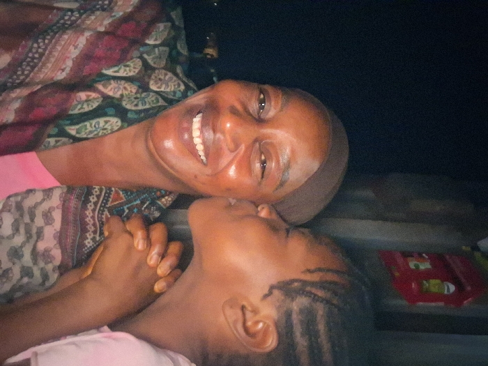 The image captures two individuals in Sabon Tasha, Nigeria, under low light conditions. On the left, an adult female with dark skin is depicted from the chest up, wearing a brown head covering and a multi-patterned fabric over a pink garment. She smiles directly at the camera, displaying white teeth, with her face exhibiting a slight sheen. On the right, a younger individual with dark braided hair leans into the adult, appearing to kiss the adult's right cheek. This younger individual's right arm is visible, with hands clasped near the adult's shoulder, and they wear a light-colored top. The background is dark and out of focus, with a blurry red object resembling a plastic crate partially visible above the younger individual's shoulder.