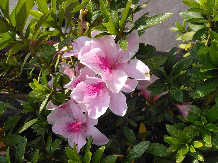 The image displays a close-up of a flowering plant featuring several pink Azalea blooms and numerous green leaves under direct sunlight. **Subjects/Objects:** * **Flowers:** Approximately five prominent flowers are visible, predominantly in the center and upper left of the frame. Each flower possesses five delicate, light pink petals with darker fuchsia speckling concentrated at the throat of the bloom, forming a distinct pattern. The stamens are visible within the darker pink centers. One flower on the far right is partially obscured. The petals show minor imperfections, including small brown spots on some edges. * **Leaves:** Dense, elliptical green leaves surround the flowers and occupy the foreground and background. The leaves are generally vibrant green, with some appearing darker in shaded areas and lighter where illuminated by sunlight. Many leaves exhibit fine white speckling, possibly dust or environmental residue. * **Background elements:** A dark, vertical, cylindrical object, possibly a support pole or a dark pot, is partially visible behind the foliage in the upper center. A light gray, indistinct surface, possibly concrete or pavement, is present in the background on the right side. **Environment/Conditions:** * **Lighting:** The scene is brightly lit by direct sunlight, creating distinct highlights on the petals and leaves, and casting some deeper shadows among the foliage. The sun appears to be positioned above and slightly to the right of the vantage point. * **Setting:** The botanical subject suggests an outdoor environment, such as a garden, patio, or potted plant display. * **People/Actions/Interactions:** No people, explicit actions, or interactions are visible in the image. The specific location within the city of San Cristóbal, Costa Rica, cannot be determined from the visual information provided in this image.