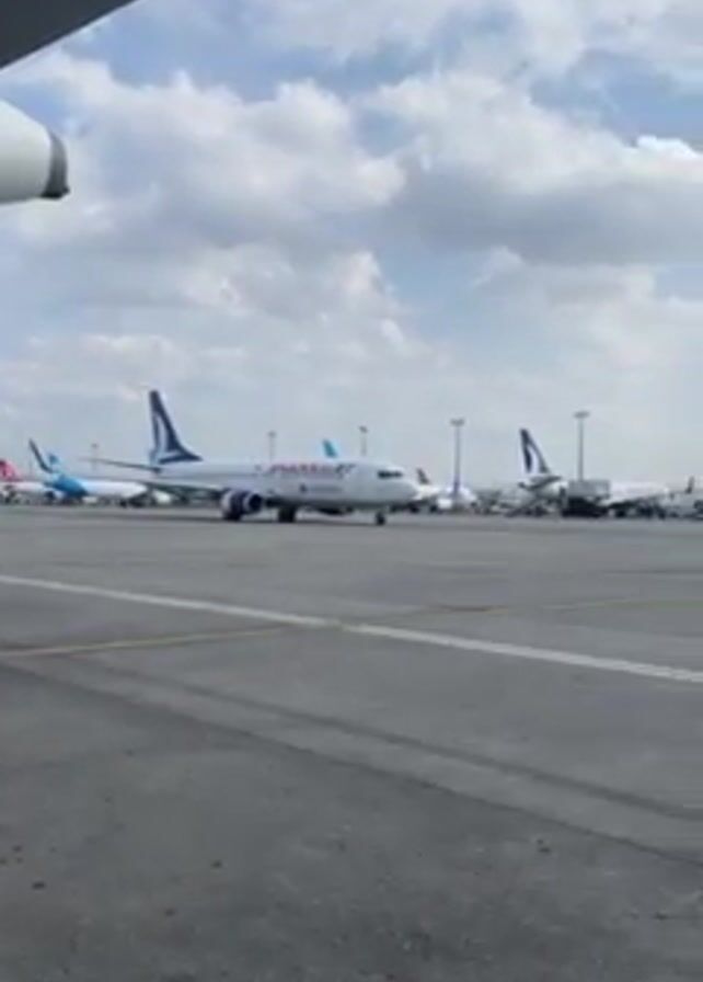 n airport tarmac from the perspective of a moving airplane. Several parked airplanes, including one with "TURKUAZ" on the side, are visible. The sky is blue with scattered white clouds. The camera pans slightly to the right, revealing more parked planes. The airport ground is grey and marked with yellow lines.