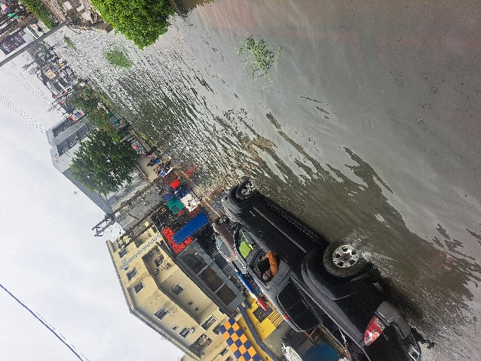 The image depicts a flooded urban street in Ikate, Nigeria, under an overcast sky