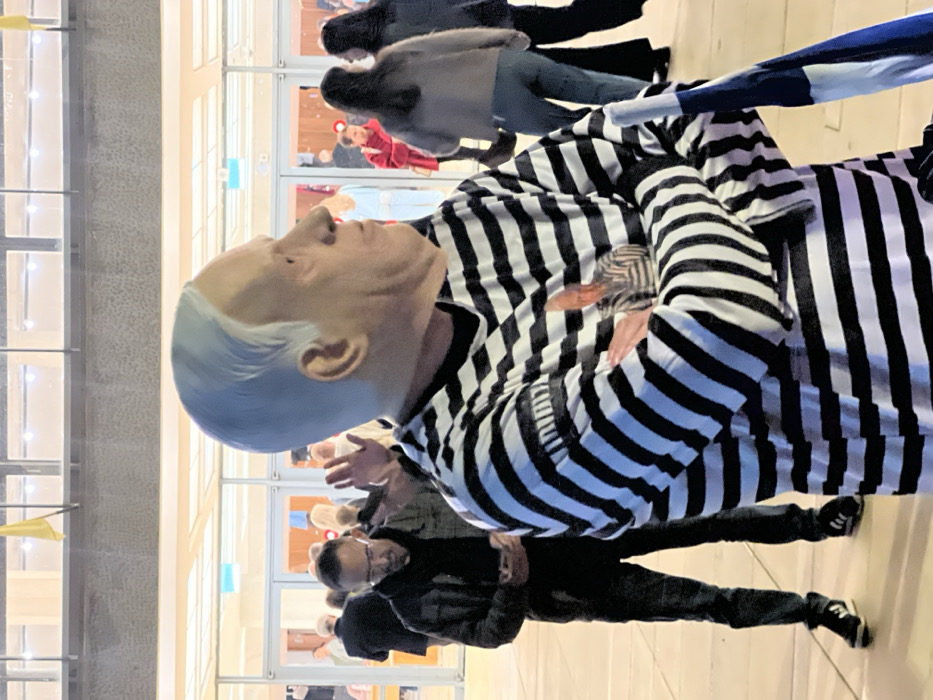 A figure, resembling a referee with a bald head and black and white striped shirt, stands with arms crossed. Behind the figure, there are people in a crowd in what appears to be a public place. There are also doors and windows visible, possibly of a building.