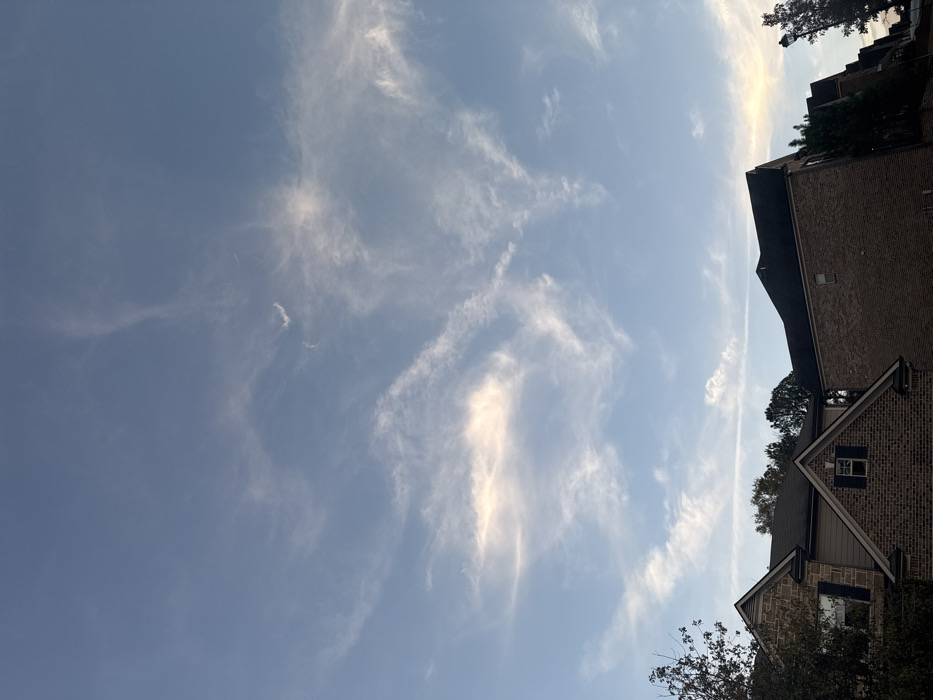 A daytime sky with wispy cirrus clouds dominates the scene. The sky is a light blue with the sun's light reflecting off the clouds. Part of a residential building with a brown brick exterior and dark roof is visible on the right. Some trees are visible on the top right and bottom right of the image. The composition is oriented vertically.