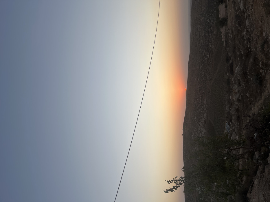 The image depicts a sunset over a hilly, arid landscape in the city of Unknown, Palestinian Territory. The sky occupies the upper two-thirds of the frame, transitioning from a pale blue at the zenith to a vibrant orange-yellow glow near the horizon. The sun, a bright orange semicircle, is partially visible just above the distant undulating hills. These hills are dark, rocky, and feature sparse vegetation, with visible patterns suggesting terraced agriculture or fields in the midground. The foreground consists of rough, dry, rocky terrain. On the left, a multi-branched green leafy plant or small tree is partially visible. A dark, thin utility wire or cable spans diagonally across the frame from the upper left to the upper right, passing over the distant landscape. No people or discernible structures are clearly visible, apart from potential small, distant shapes on the hillsides.