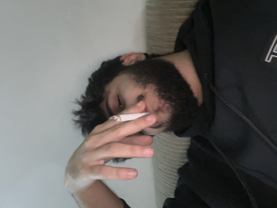 A man reclines, head tilted, a lit cigarette between his lips and fingers. He has dark hair and a full, dark beard. He wears a black hooded sweatshirt with a partial, white letter visible on the upper right. The background shows a neutral-colored wall and a textured surface resembling a couch or cushion. The image is taken from a low angle, giving the impression of looking up at the subject.