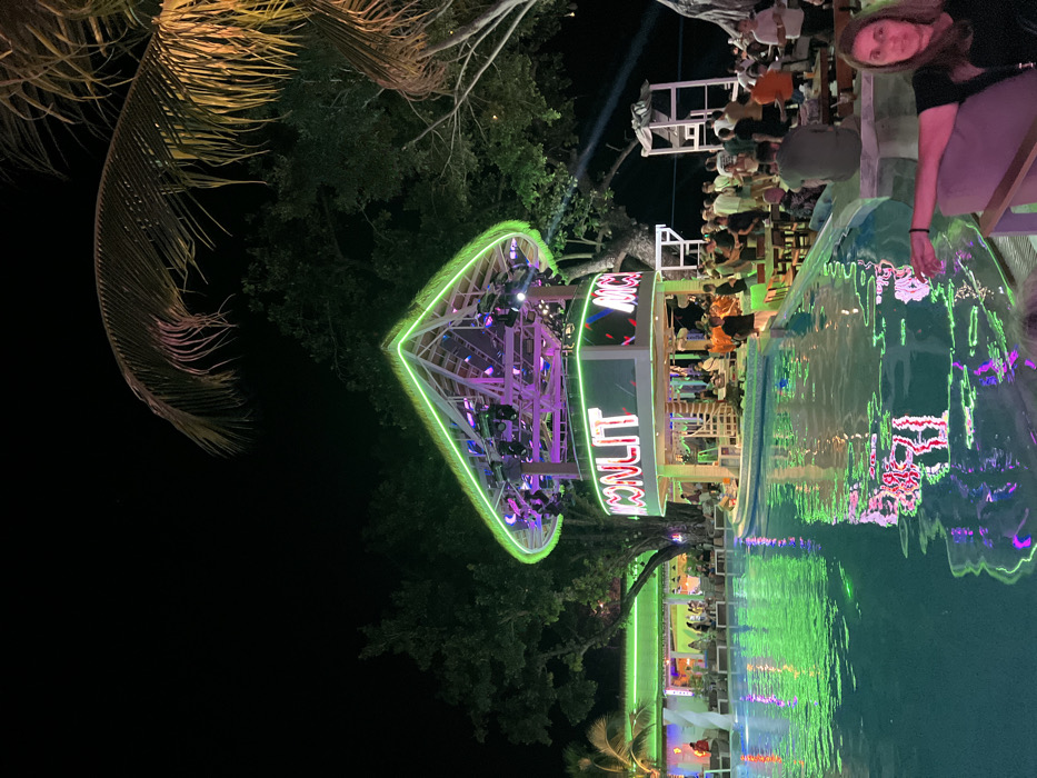 Nighttime scene reveals "Coconut" structure illuminated in neon green, partially obscured by trees and foliage. People gather around the structure, near a pool reflecting neon lights. A woman sits on the pool's edge, visible in the upper right corner. Palm fronds extend into the dark sky on the left.