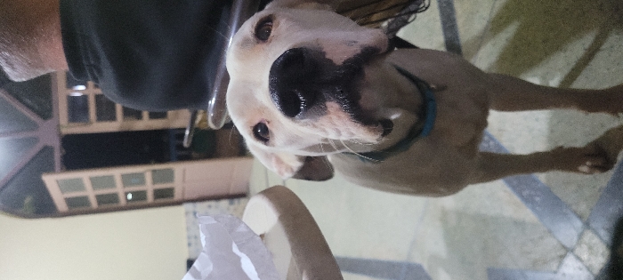 The scene, set in an indoor or covered outdoor area within the city of Dkhissa, Morocco, is illuminated by artificial light, indicating evening or nighttime conditions. A light-colored dog with a black nose, dark eyes, and floppy ears stands prominently in the foreground, wearing a blue collar and looking directly towards the camera. To the upper right, the back of an individual's head, displaying short hair, and the top of a dark-colored garment are partially visible and out of focus. On the left side of the frame, a light-toned surface, potentially a table, supports a crumpled piece of white paper. In the background, an arched doorway with two light-colored, paneled doors, one slightly ajar, opens to a darker, unlit space beyond. The floor throughout the visible area is composed of light-toned tiles.