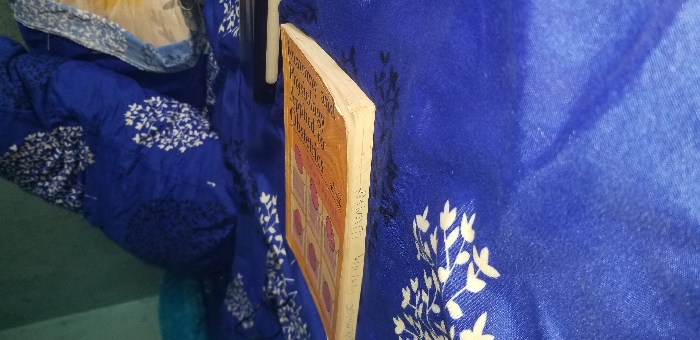 The scene depicts an indoor environment, specifically what appears to be a bed in the city of Unknown, Unknown. A horizontally oriented book with an orange cover featuring a grid of six reddish-pink squares and partially visible English text (including "APPLIED TO CIVIL ENGINEERING" and "QUANTITIES") rests on a dark blue bedspread or blanket. The book's spine, facing the viewer, displays "VISWANATH" and "GUPTA." The bedspread has a repeating white floral or leaf pattern. Behind the book, a crumpled or folded blue pillow or additional bedding, also with the white floral pattern, is visible. To the right of the book, a dark object, possibly another book or a case, is partially obscured. In the upper left background, a light greenish-blue wall is visible. No individuals are present.