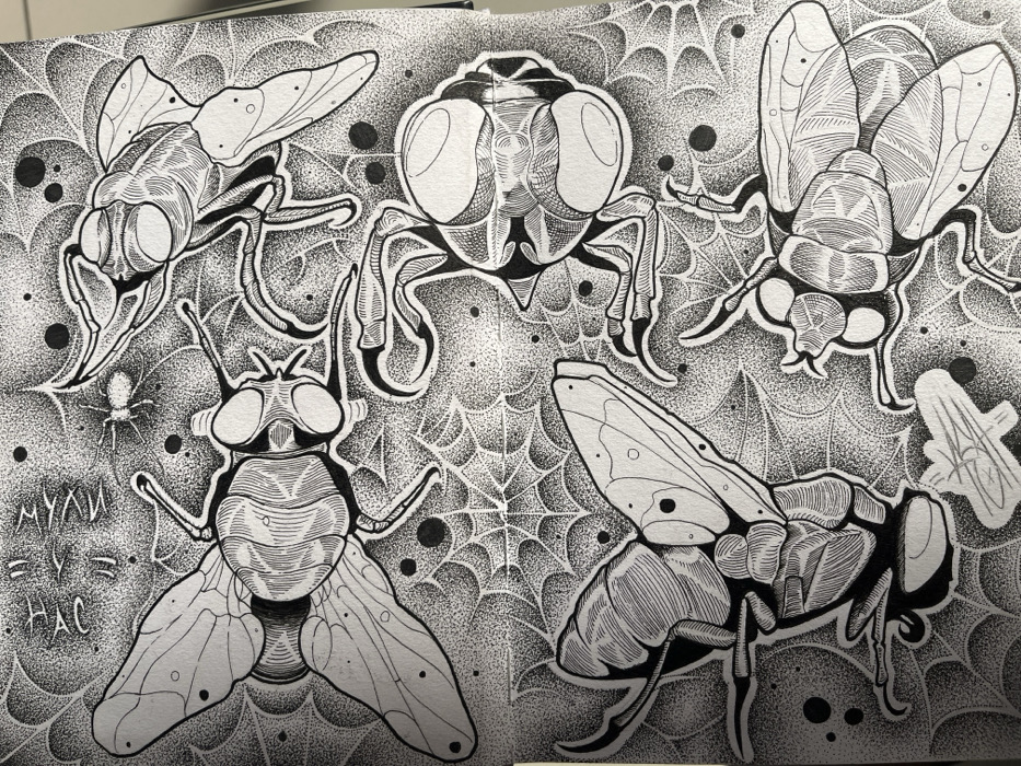 - "The image displays a black and white stippled ink drawing, attributed to Rostov-on-Don, Russia, depicting five stylized large insects and one small spider" by FM-BhCGm1, licensed under CC BY 4.0