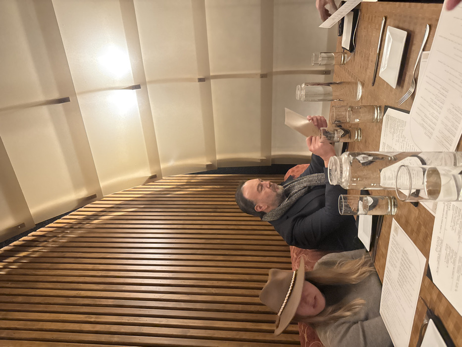 A restaurant scene features a man in a dark jacket and scarf reading a menu, seated at a long table laden with glasses, plates, silverware, and menus. A woman in a hat sits beside him. The table is set against a wall with horizontal wood panels at the bottom and white curved panels above, illuminated from behind, creating a modern, upscale ambiance. Other patrons and hands are visible at the top of the image.