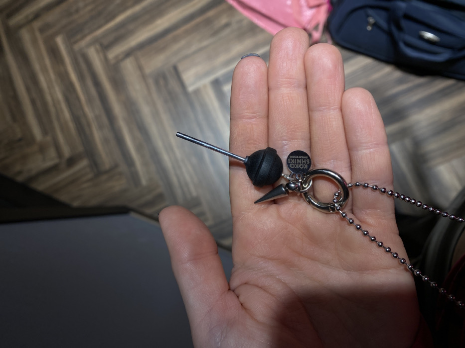 A hand holds a silver ball chain necklace featuring a circular clasp, a pointed spike, and a black tag with "KOKO SHNKI STUDIO" printed on it. A black, round bulb with a silver needle-like extension is also attached to the necklace. The background includes a wood-patterned surface, a pink item, and a navy blue bag.