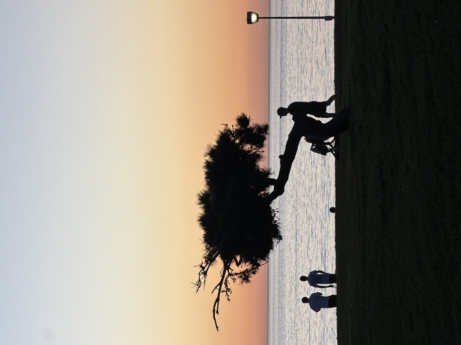 A silhouetted tree stands along a shoreline at sunset. The sky transitions from light blue to orange. Two silhouetted figures are near the shoreline. Further up, a person is perched on the tree's bent trunk. A lamppost stands behind the tree, while a grassy area occupies the right side. A bicycle rests next to the tree's trunk.
